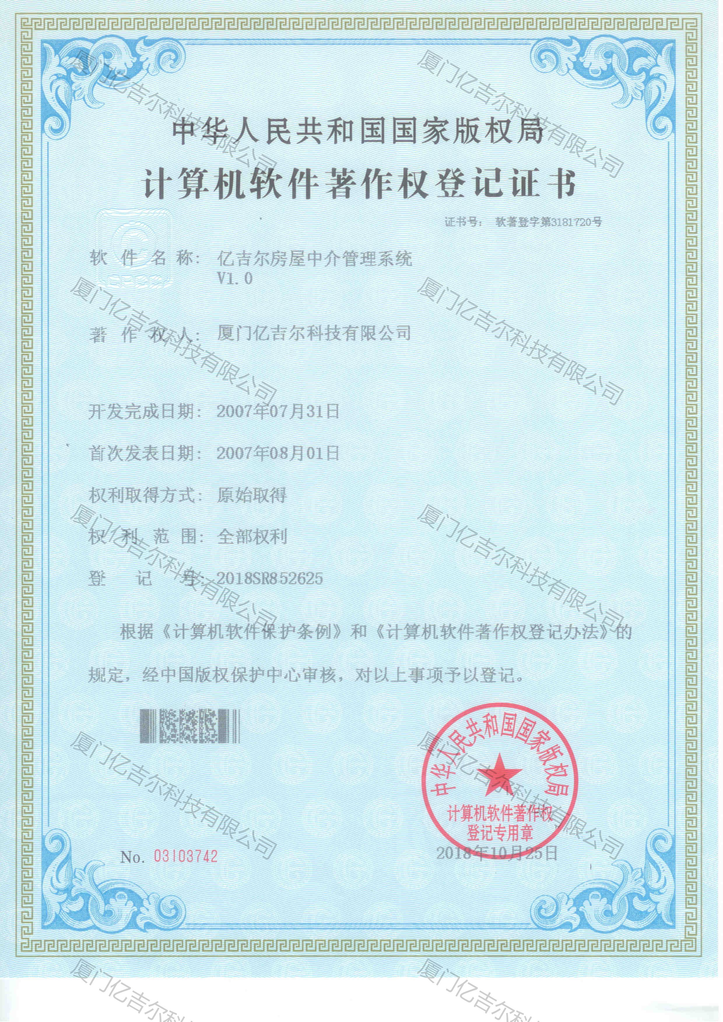 億吉爾房屋中介管理系統(tǒng)軟件著作權(quán)登記證書 發(fā)布日期:2018年10月25日 瀏覽次數(shù):3660 關(guān)鍵字: 公司 1/1億吉爾房屋中介管理系統(tǒng)軟件著作權(quán)登記證書