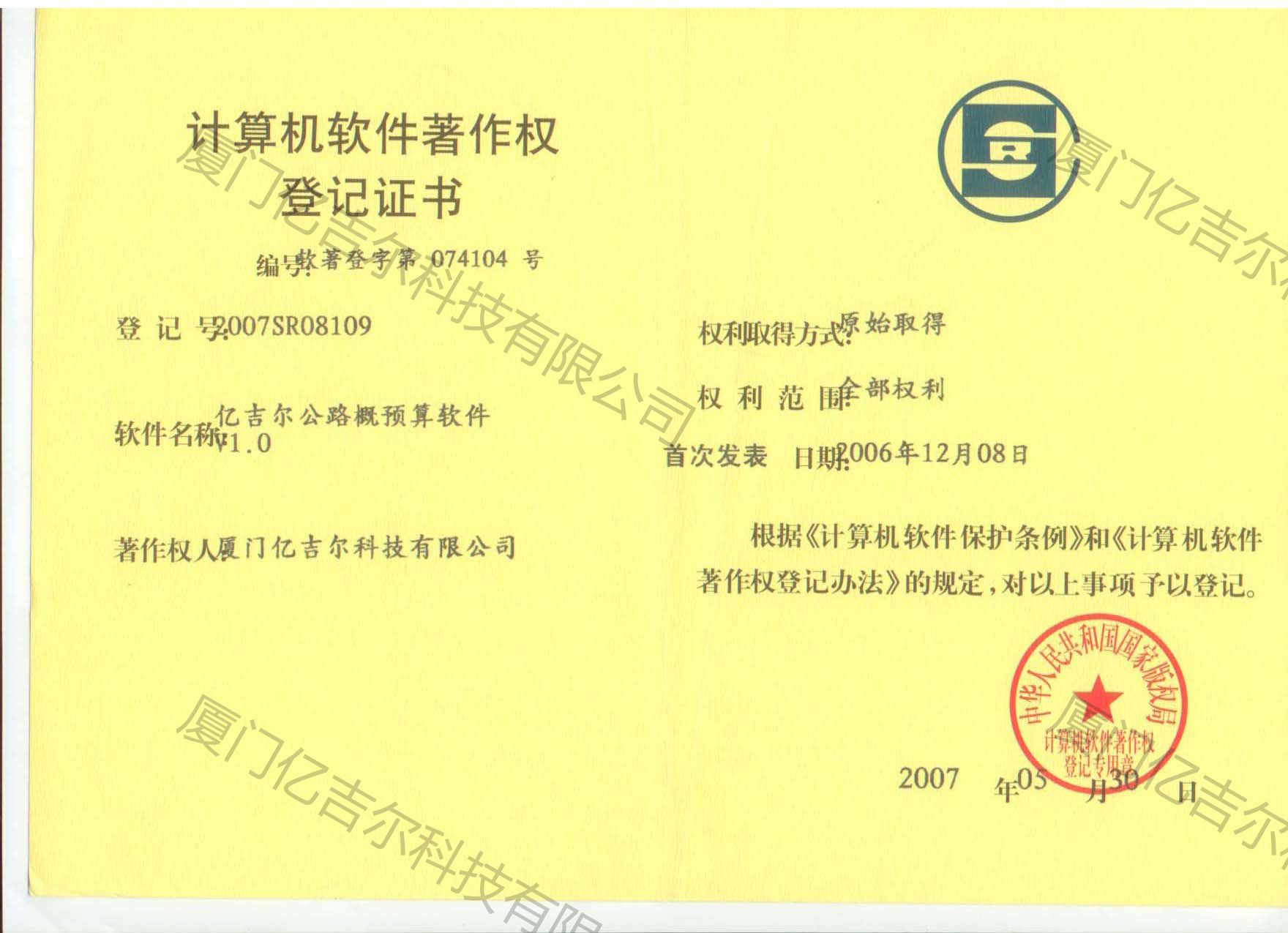 億吉爾公路概預(yù)算軟件著作權(quán)登記證書 發(fā)布日期:2007年05月30日 瀏覽次數(shù):3262 關(guān)鍵字: 公司 1/1億吉爾公路概預(yù)算軟件著作權(quán)登記證書