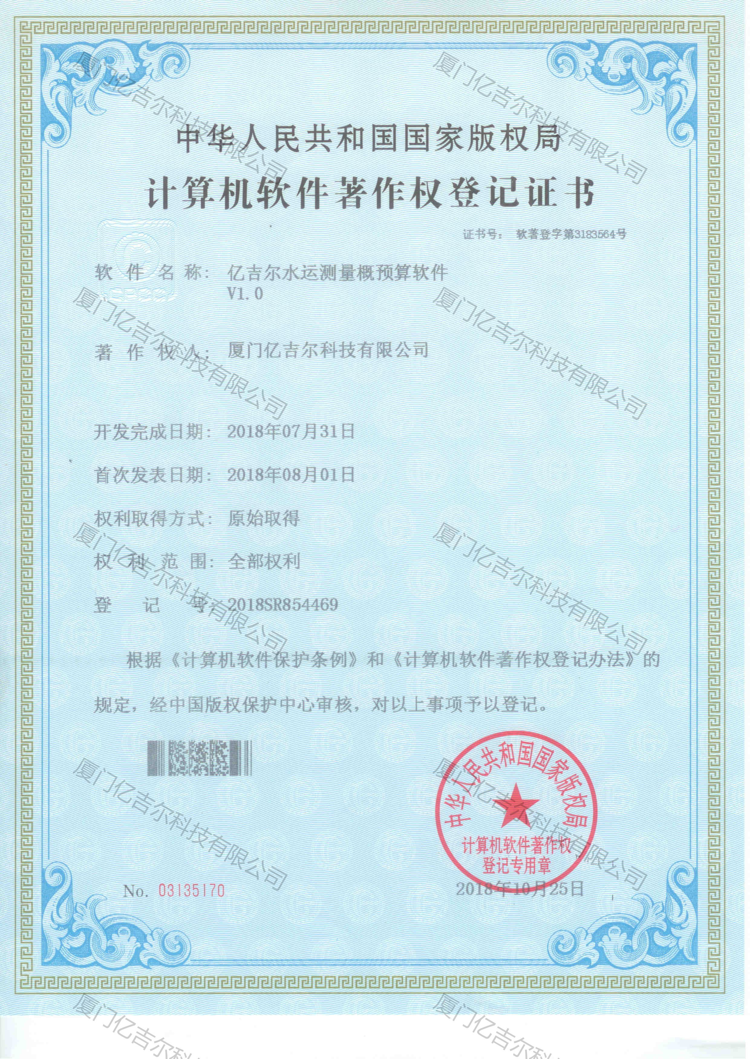 億吉爾水運(yùn)測(cè)量概預(yù)算軟件著作權(quán)登記證書(shū) 發(fā)布日期:2018年10月25日 瀏覽次數(shù):3587 關(guān)鍵字: 公司 1/1億吉爾水運(yùn)測(cè)量概預(yù)算軟件著作權(quán)登記證書(shū)