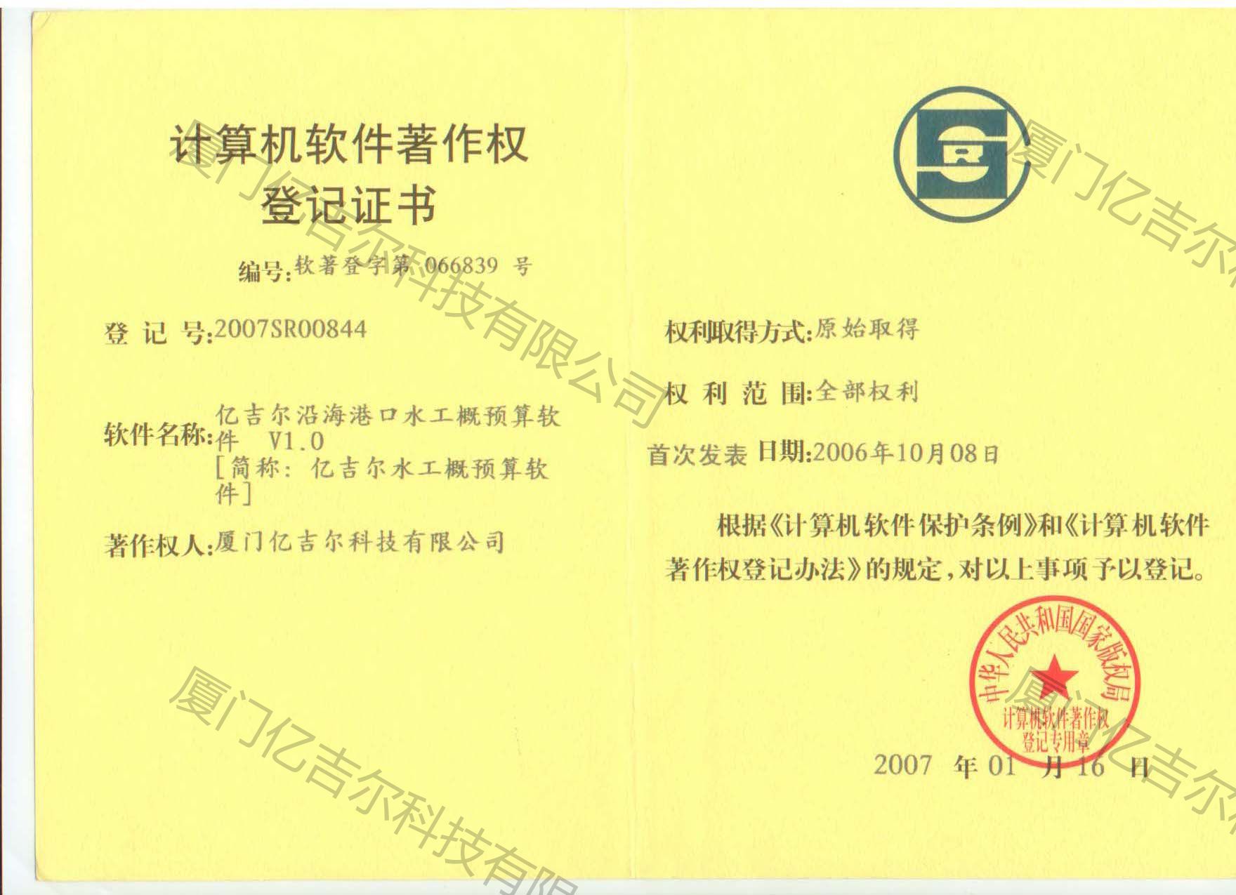 億吉爾沿海港口水工軟件著作權(quán)登記證書(shū) 發(fā)布日期:2007年01月16日 瀏覽次數(shù):3415 關(guān)鍵字: 公司 1/1億吉爾沿海港口水工軟件著作權(quán)登記證書(shū)