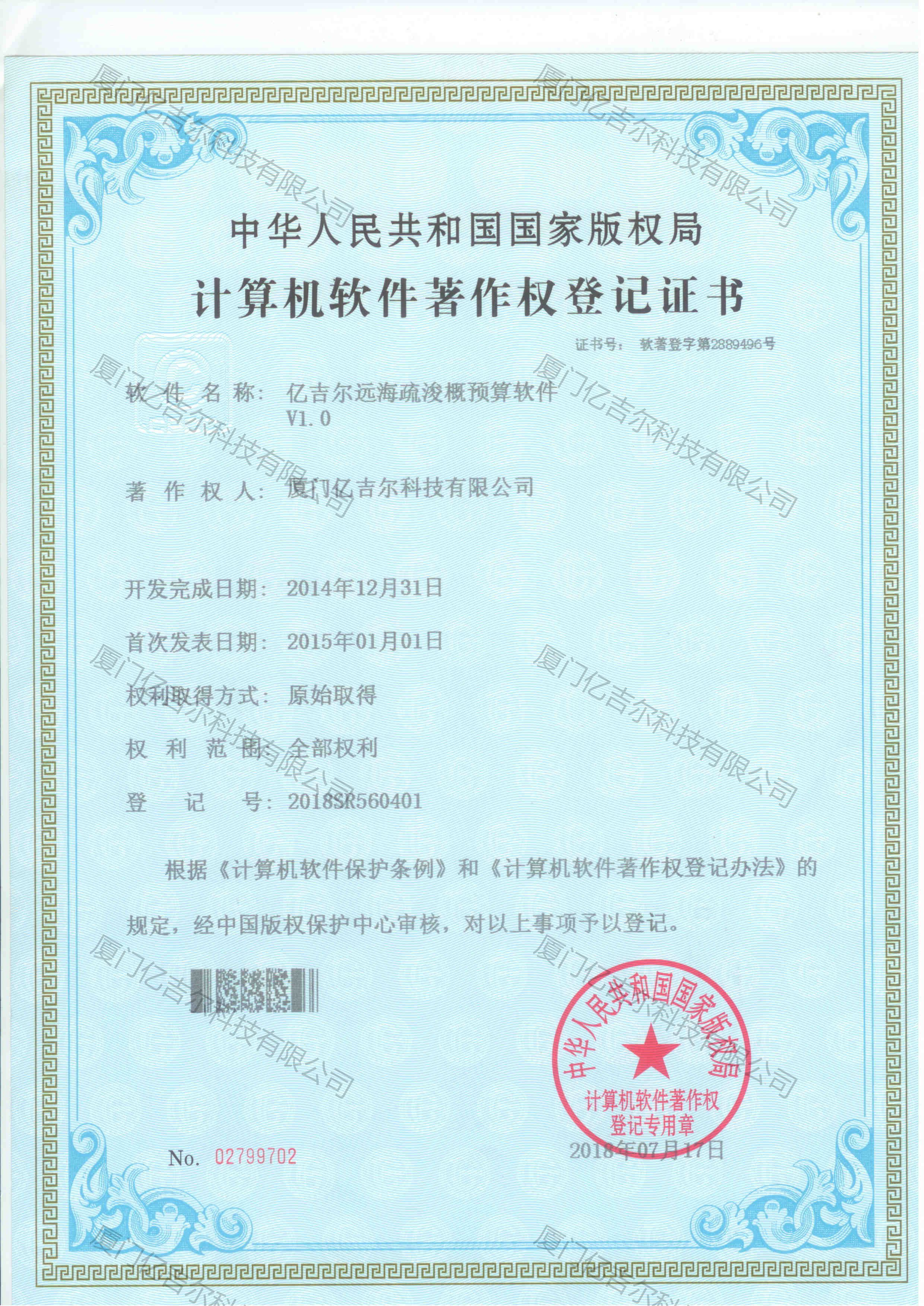 億吉爾遠(yuǎn)海疏浚概預(yù)算軟件著作權(quán)登記證書 發(fā)布日期:2018年07月17日 瀏覽次數(shù):3369 關(guān)鍵字: 公司 1/1億吉爾遠(yuǎn)海疏浚概預(yù)算軟件著作權(quán)登記證書