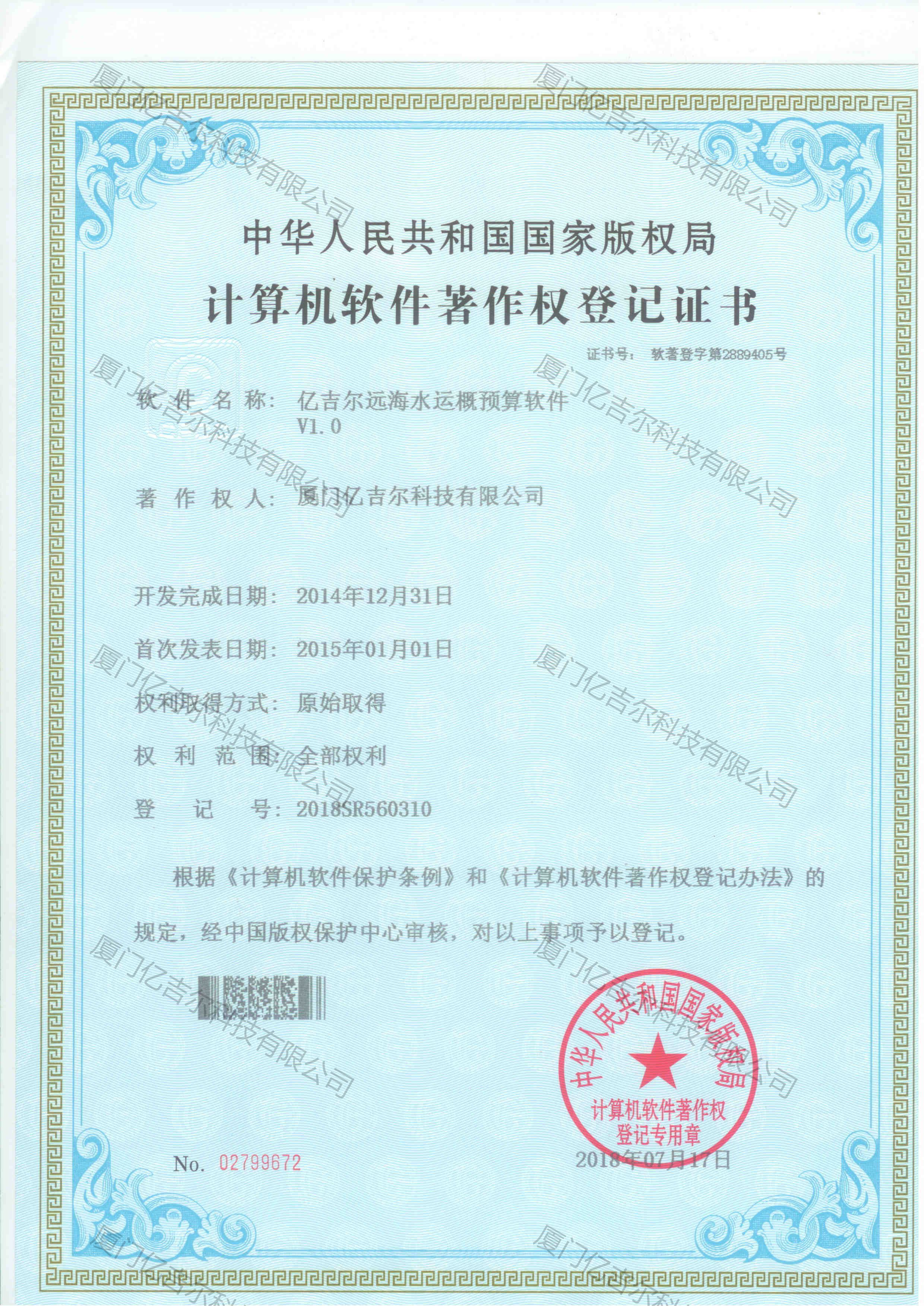 億吉爾遠海水運概預(yù)算軟件著作權(quán)登記證書 發(fā)布日期:2018年07月17日 瀏覽次數(shù):3432 關(guān)鍵字: 公司 1/1億吉爾遠海水運概預(yù)算軟件著作權(quán)登記證書